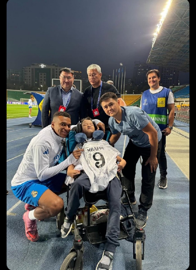 The image from the stadium in Almaty shows the child holding the signed jersey, surrounded by six individuals including two men in suits, two in sportswear, and one wearing a vest labeled “CHANNEL,” likely part of the media team. The stadium lights shine over empty seats, framing the emotional moment with quiet reverence. The child, clearly the center of attention, radiates joy as Mbappé’s gesture turns a routine post-match scene into something unforgettable.