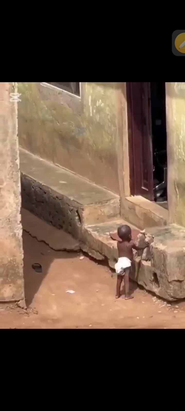 The child appeared malnourished, clad only in a diaper, and was seen drinking from an unclean container.