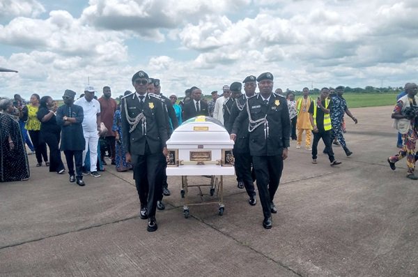 The News Agency of Nigeria (NAN) reports that Nigerian Air Force flight NAF 031, which conveyed the body touched down at the Benin Airport at 1:25 p.m.